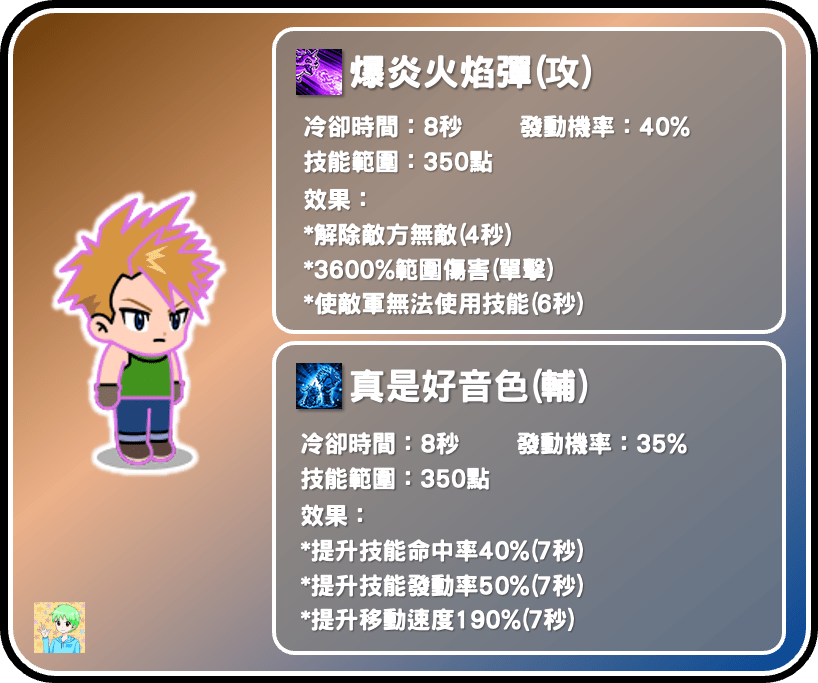 大和的一技能是攻擊技能,與太一還蠻相似的,都有持續解除無敵跟傷害,差異僅有負面效果,大和給予的負面效果是禁言,也是一項還不錯的負面效果,配合電暈、變身等其他控場會有不錯的發揮。