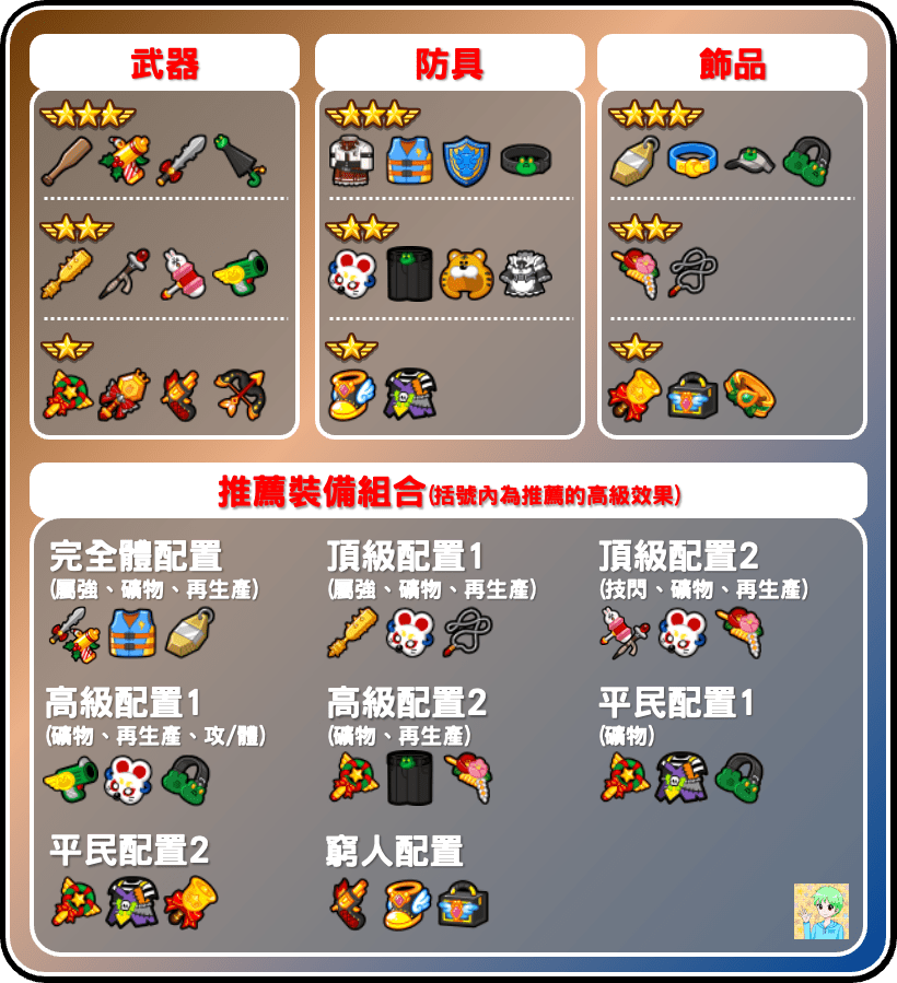 圖片上半部是推薦能使用的裝備,其中屬性裝備皆為合作裝備,目前適用的減產必中有聖誕神聖槍、鱷魚王的劍及正覺涅槃棒(七星武器第一個),不在上表中的妖刀菊十文字也可以使用。下半部也有推薦一些裝備組合供各位參考,如果閃抗充足的情況下,裝備的高級效果建議優先選擇減少礦物。