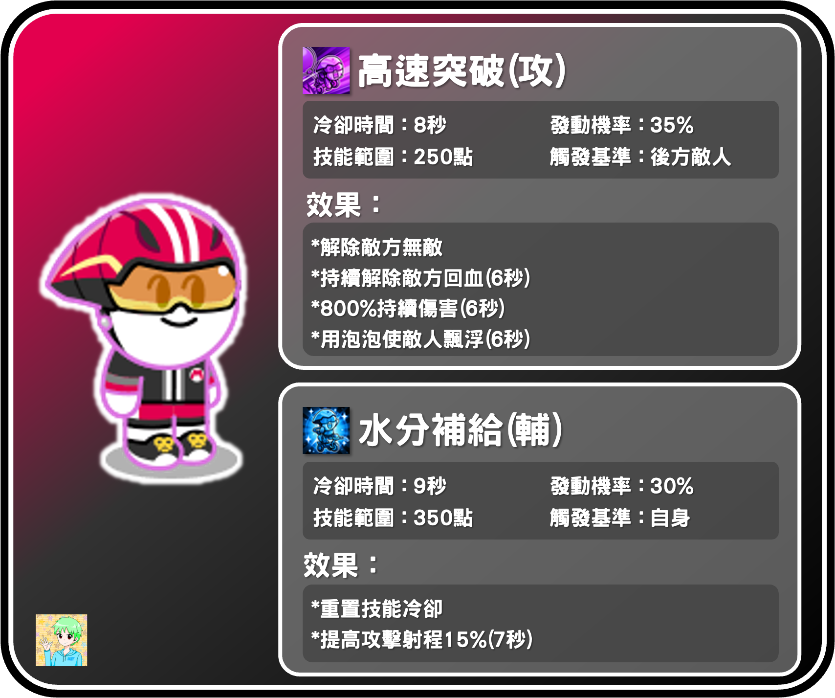 由於基礎數據實在是與環境落差太大,即便官方開放自行車饅頭人的才能,目前看起來依然很難成為強勢寵,應該只有公會戰有他發揮的餘地,若想玩泡泡控場,還是建議使用救生員榮恩會更好,不建議砸資源在自行車饅頭人身上。