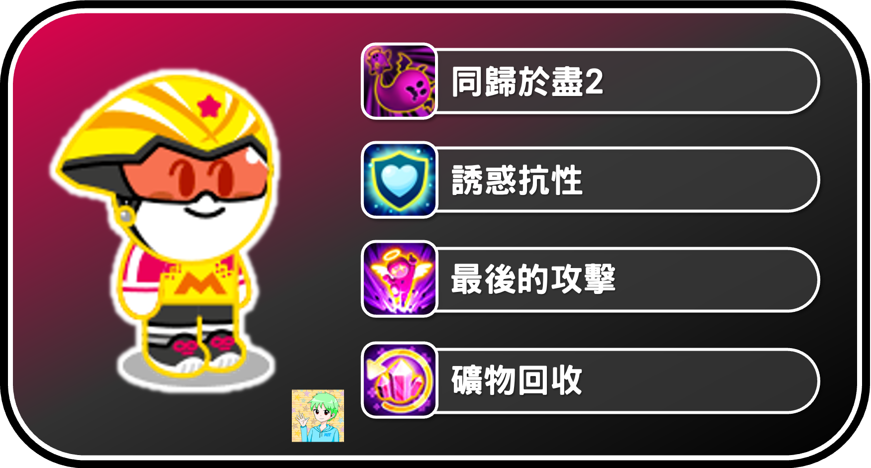 饅頭人九星進化後,可以從以上四種能力中隨機獲得一項,如果想讓泡泡技能有更顯著的效果,可以選擇最後的攻擊。如果想玩同命流,則可以使用同歸於盡2,用法會類似於2023年的稻草人饅頭人。誘惑抗性跟礦物回收則是目前環境尚不強勢,因此不推薦使用。