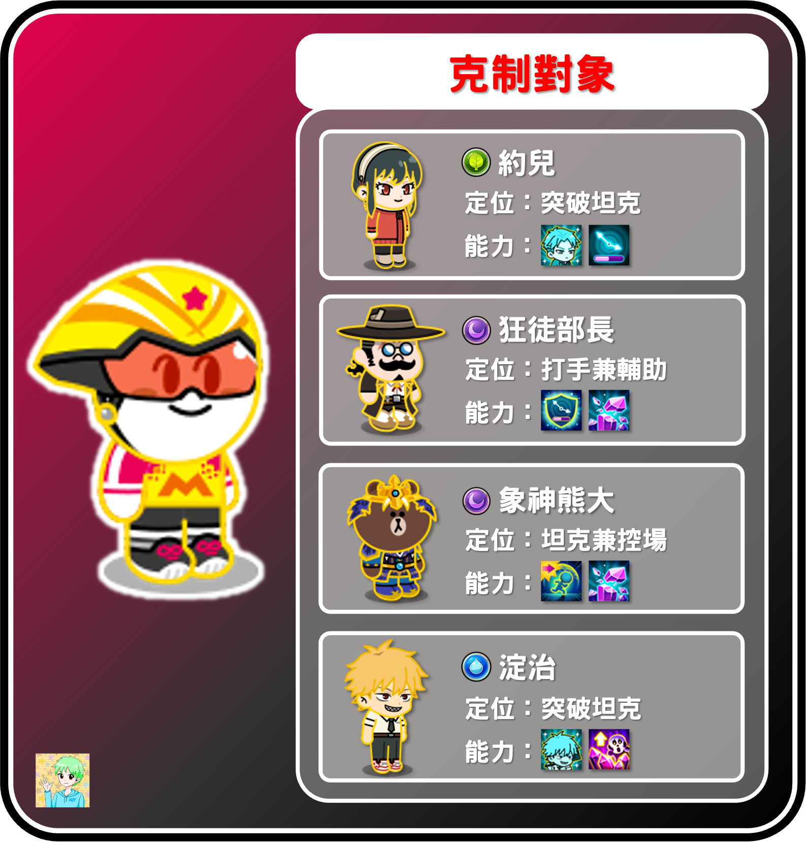 身為泡泡的始祖寵,除了利用屬性優勢克制暗屬性角色外,還可以用來針對目前環境強勢的坦克,例如約兒和淀治,直接打死會讓他們觸發毅力,導致我方被卡戰線,若能使用泡泡直接移走,我方就能更快速的推線,在戰鬥中搶到更多的戰線。