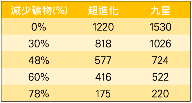 下表是為各種減礦時的礦物量(寶物全滿、無月間加成):