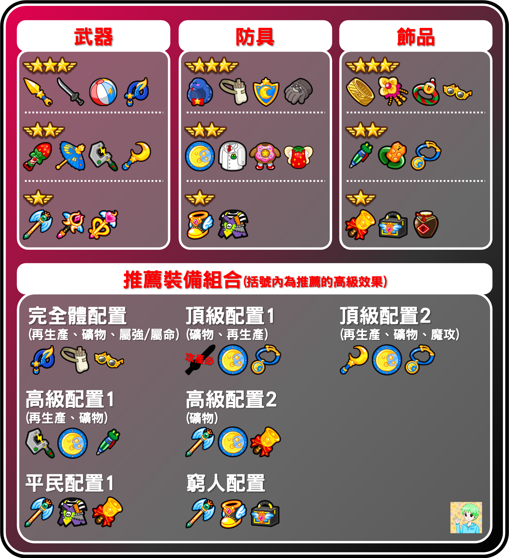 圖片上半部是推薦能使用的裝備,其中屬性裝備皆為跑跑裝備,目前適用的減產必中有新年青龍鞭、月光匕首,或八月份的合作光屬武器「秋的刀」。下半部也有推薦一些裝備組合供各位參考,由於礦物量不算高,若不強求低礦物量,高級效果可以考慮考慮選擇技能閃避機率或技能抗性。