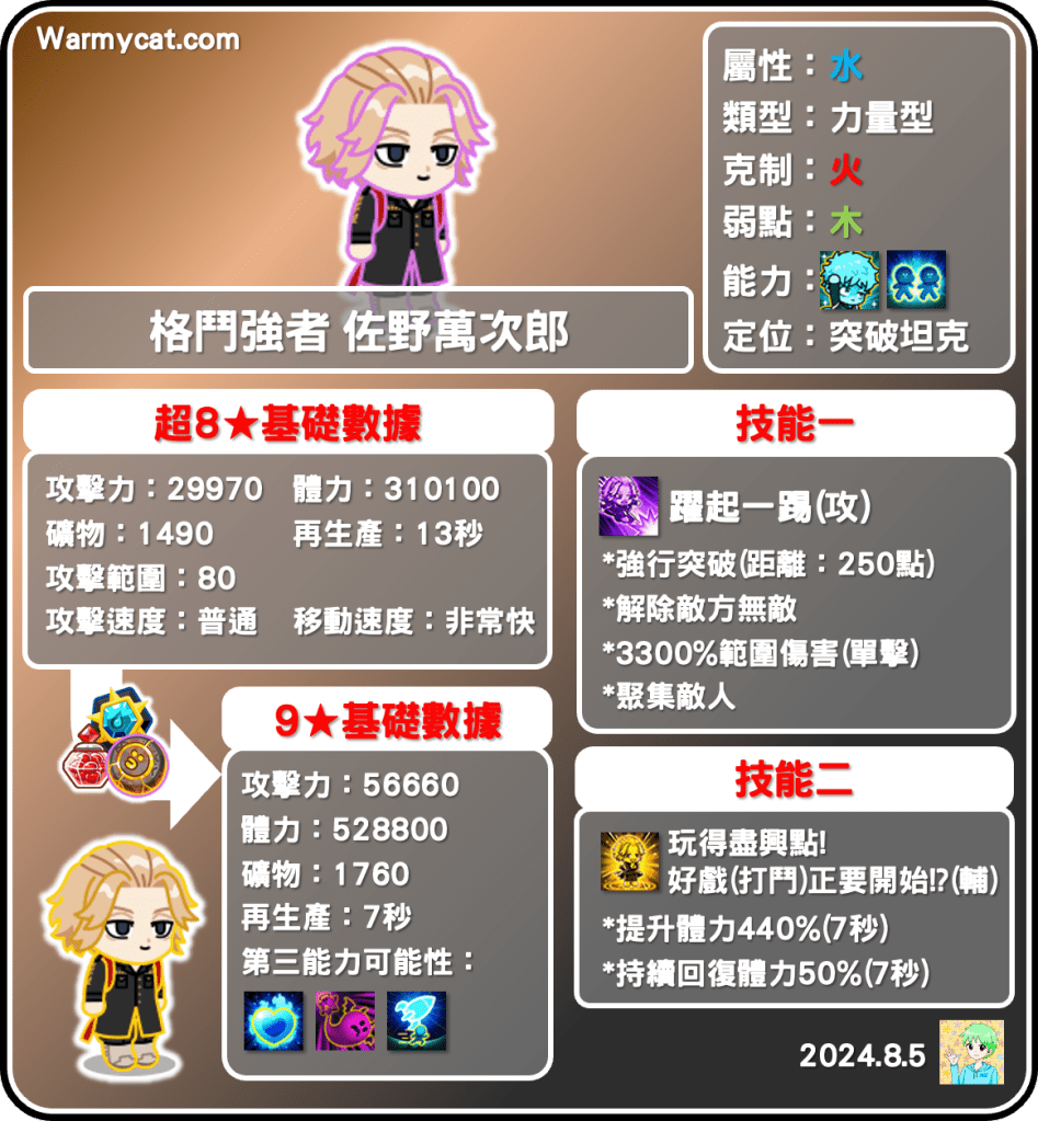 有別於去年的,今年的萬次郎是水屬性力量型,攻擊力2.9萬、體力31萬均落在平均值附近,但以突破寵來說就還行,超進化略贏艾連一點點。礦物量1490不算太高,不過裝備還是有減礦會比較好,站位80點是今年大獎坦克中最短的,能力是「複製分身+」,可以高機率一次派出兩隻角色。