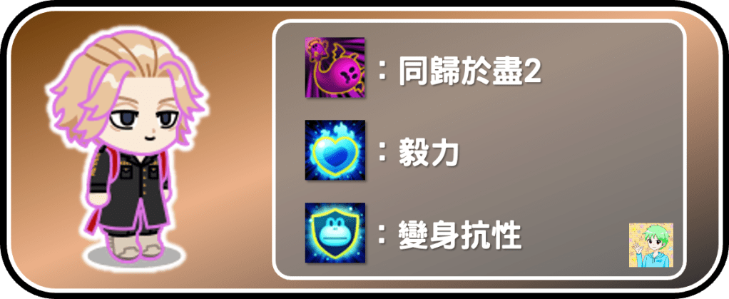 萬次郎九星進化後,可以從以上三種能力中隨機獲得一項,最推薦的能力是毅力,在扛線的能力會大幅提升,同時也可以用於毅力飛寵隊,同歸於盡2則適用於公會戰,讓萬次郎被打倒時高機率可以帶走對手一隻敵人,以維持雙方角色數量差距,變身抗性則不太好用,畢竟目前主流環境仍然沒有常駐的變身角色。