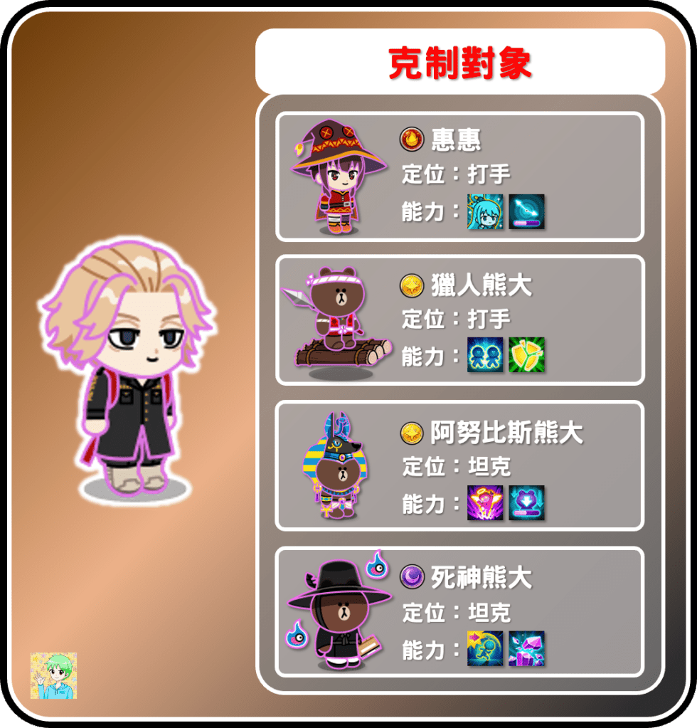 雖說佐野萬次郎的各項數據技能都不算太糟糕,但礙於現在是妨礙的天下,不屬於礙產礙礦的萬次郎日後很難成為強勢角色,因此不建議大師以上的玩家花資源抽扭蛋,不過由於能力的複製分身+可以大幅提高產量,適合黃金、鑽石段位缺坦克的玩家用扭蛋卷試試手氣,畢竟萬次郎的裝備門檻會其他人相對低一點,比較不用考慮再生產速度,不建議砸鑽石抽寵,鑽石還是留著等裝備會比較好。