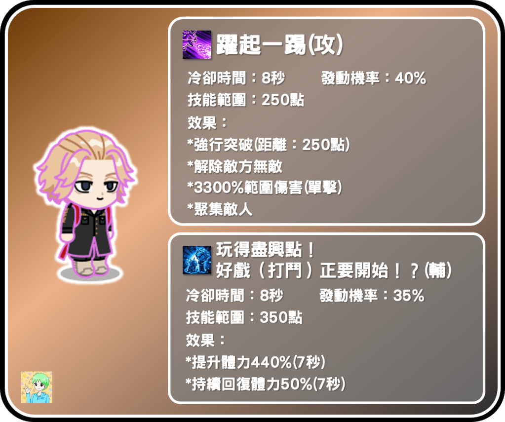 萬次郎的二技能是輔助技能,效果有提升體力跟回血,整體有一點單調,對於突破寵來說也稍顯不足,如果能再多一項補閃會比較好,比較能確保萬次郎突破後的存活率。
