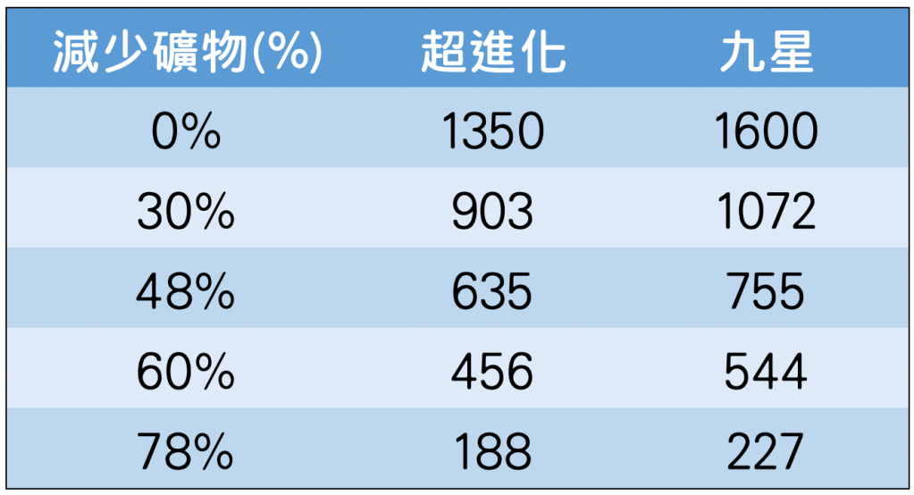 下表是為各種減礦時的礦物量(寶物全滿、無月間加成):