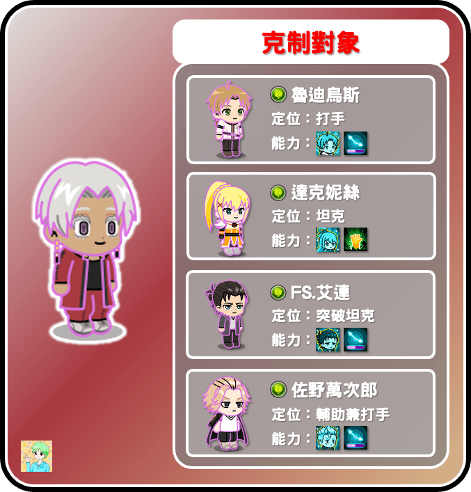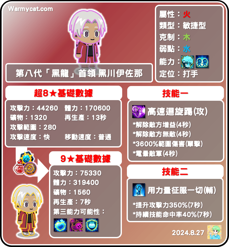 身為火屬性的黑川伊佐那,克制木寵算是他的本業,例如萬次郎、艾連、魯迪、達克妮絲…等近期的木寵,不過由於敏捷型的傷害比不過智慧型,因此輸出效果可能與智慧型會有差距。