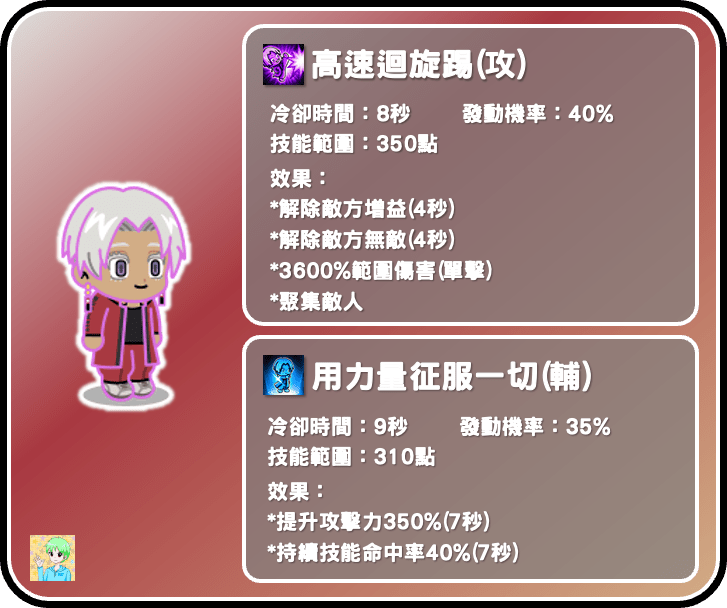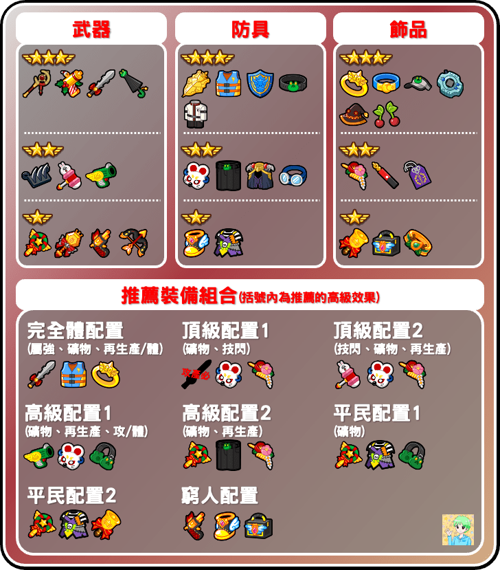 圖片上半部是推薦能使用的裝備,其中屬性裝備皆為近期的合作裝備,其中武器類的芙莉蓮的手杖(8星第一個)、聖誕神聖槍(8星第二個)、鱷魚王的劍(8星第三個)、柳龍光的暗器(7星第一個)屬於「減產必中」的武器,新年兔子槌(7星第二個)屬於「技能再發必中」的武器,玩家可以參考上半部的裝備,並挑選擁有的裝備自行組合,若對於配裝想法不明確,亦可參考下半部的推薦配裝。