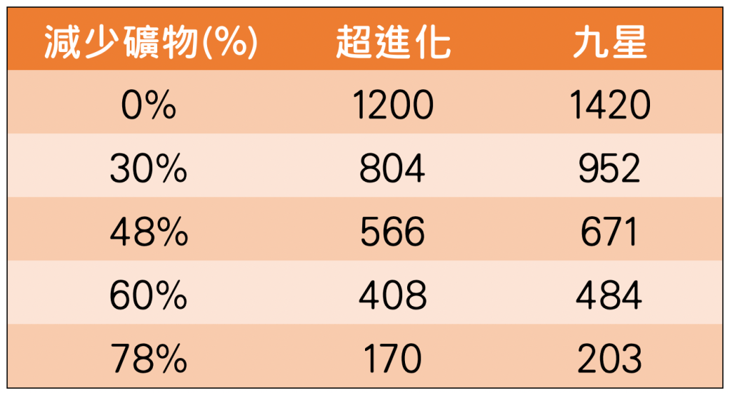下表是為各種減礦時的礦物量(寶物全滿、無月間加成):