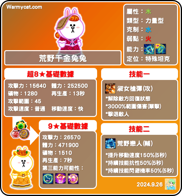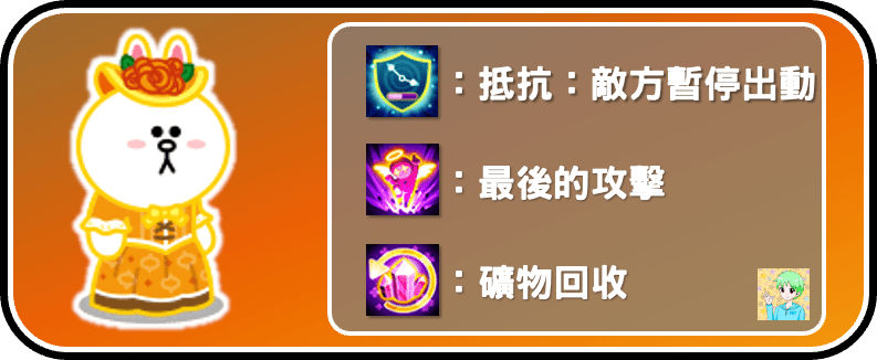 千金兔兔九星進化後才是他強大的開始,唯一推薦「抵抗:敵方暫停出動」,擁有此能力後基本上就能無間斷出兔兔扛線了,即使被壓塔也還可以拖很長一段時間,與「出動防護罩+」一起時是相當噁心的組合。其餘兩項能力無法讓兔兔改變太多,因此都不推薦。