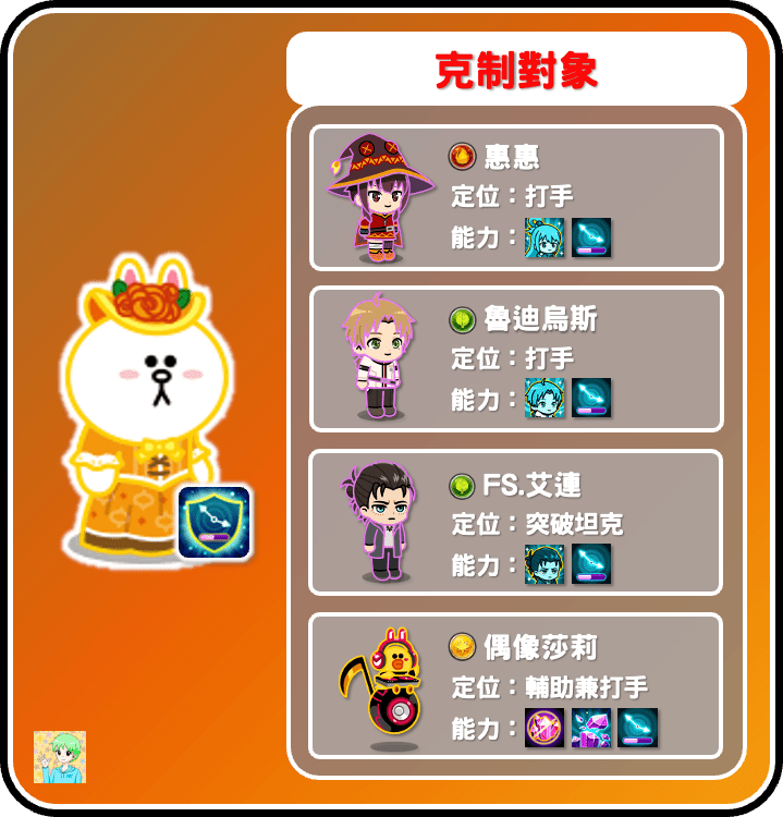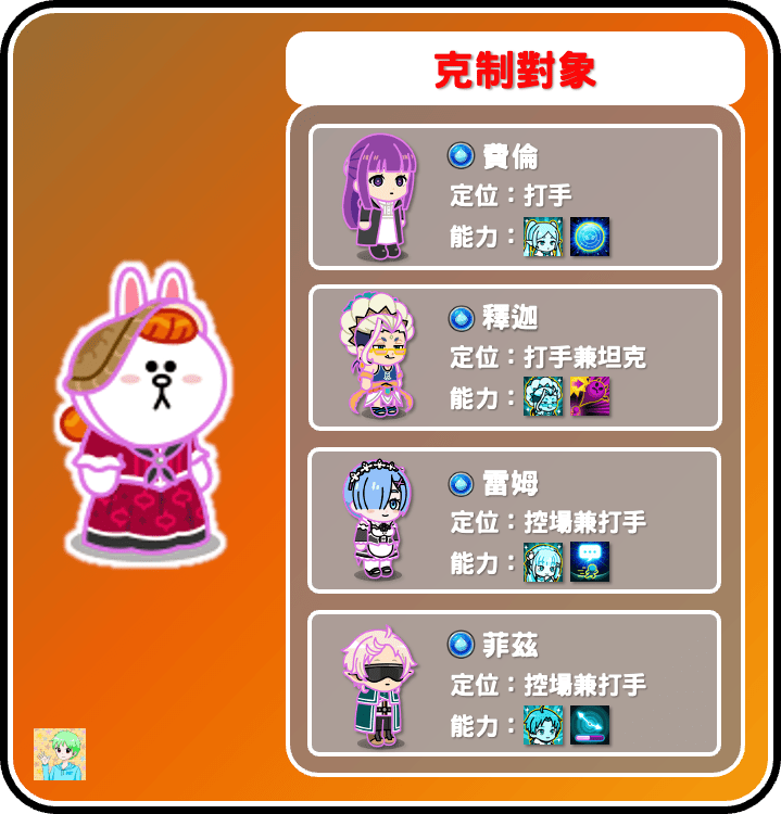 若千金兔兔擁有「停產抗性」,那麼他的克制對象就會完全不同了,會從「克制水打手」改為「克制停產寵」,最常見的使用方式是配合飛翔角色使用,利用「出動防護罩」拖時間,進而讓飛翔角色偷塔取勝,是近期新出現的害惡打法!也是目前門檻較低的PvP爬分方式。