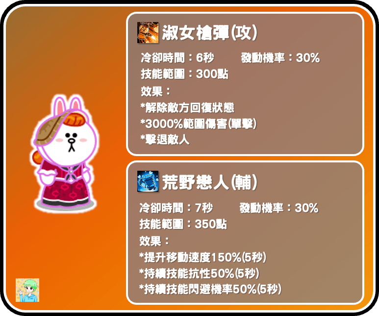 千金兔兔的二技能有提高移動速度及補閃抗,在PvP、跑跑活動中都相當適用的技能組,能讓新手玩家可以補齊裝備缺閃或缺抗的問題,以提高坦克的抗線能利,是很優異的坦克技能。