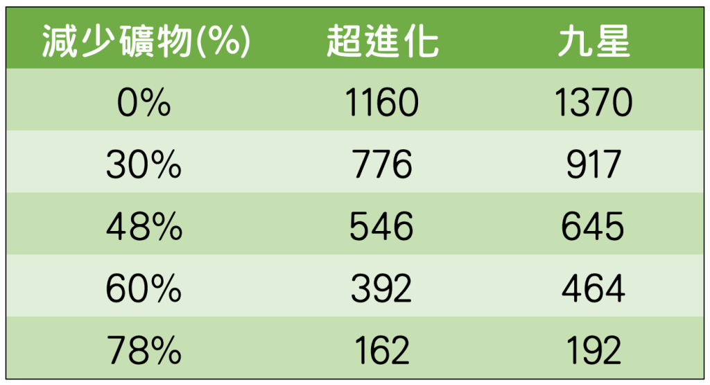 下表是為各種減礦時的礦物量(寶物全滿、無月間加成):