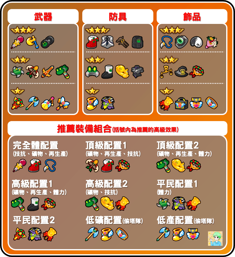 圖片上半部是推薦能使用的裝備,其中推薦的屬性裝備皆為合作裝備,目前適用的減產必中有八星的10週年麥克風及七星的聖誕冬青聖弓,第四項優先建議選擇減少礦物。