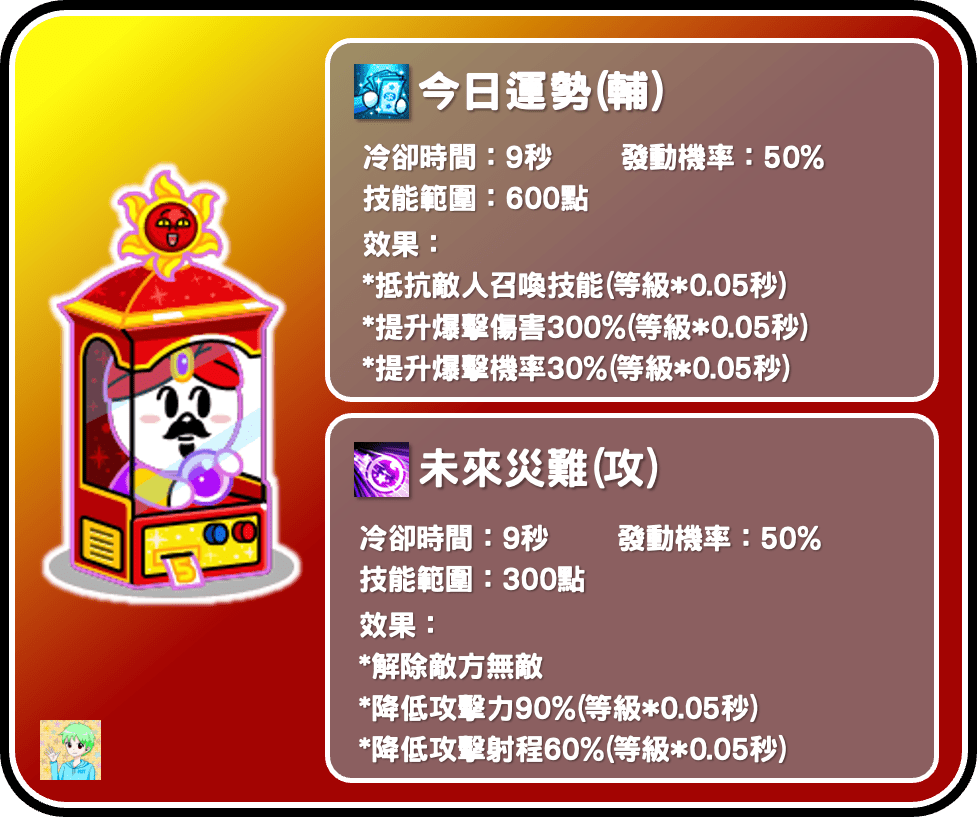 占卜師饅頭人的二技能是控場招式,有著解除敵方無敵、降低攻擊力跟降低站位,主要的看點是降低60%站位,是全遊戲最高的數據,同時這項技能是打後排,也就能讓敵方的後排角色失去站位優勢,讓我方的技能更容易攻擊到,實戰上算相當有感。