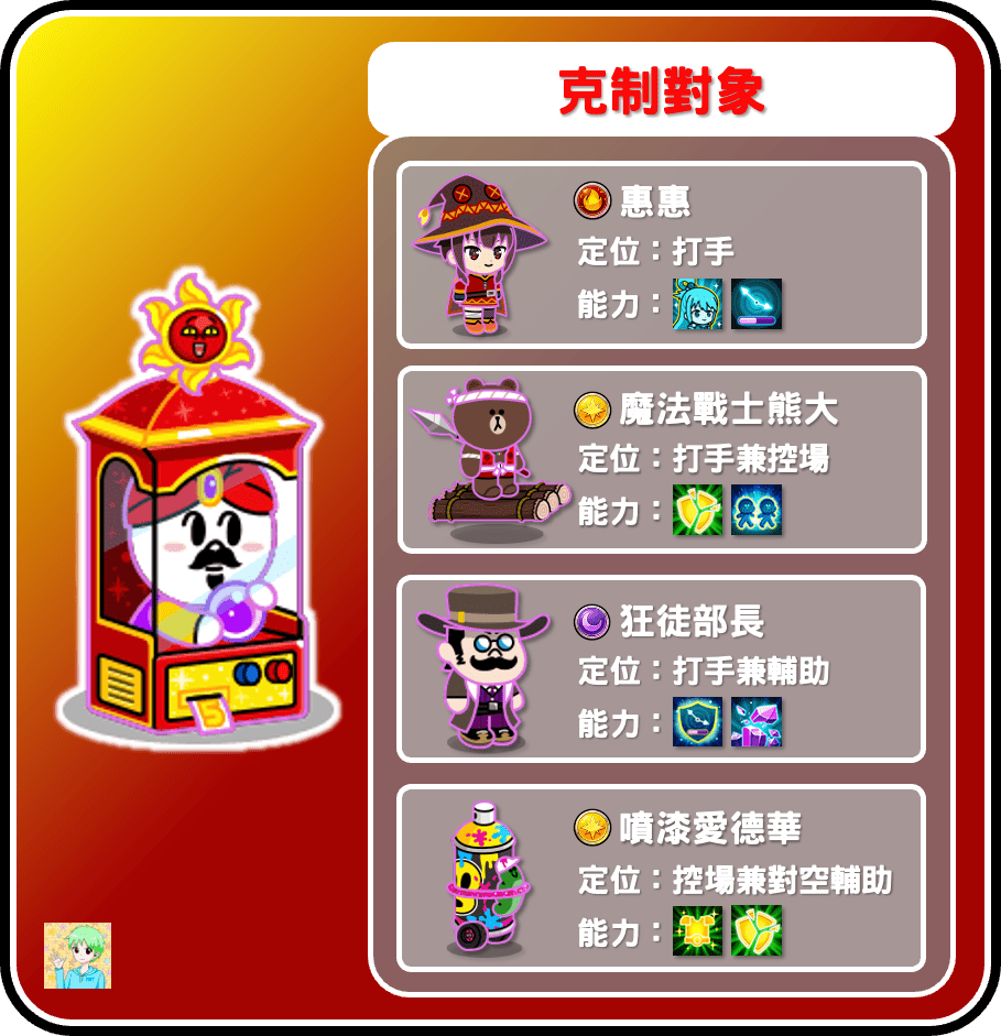 占卜師饅頭人是一隻無視屬性的寵,主要針對超遠站位的角色,像是惠惠(站位500點)、獵人熊大(站位770點)、狂徒部長(480點)或噴漆愛德華(站位750點),除非我方有擴大技能範圍的角色,不然圖片中的角色都不太好處理,常常打不死,就可以透過占卜師讓他們更靠近我方,讓我方打手能更容易的解決他們。
