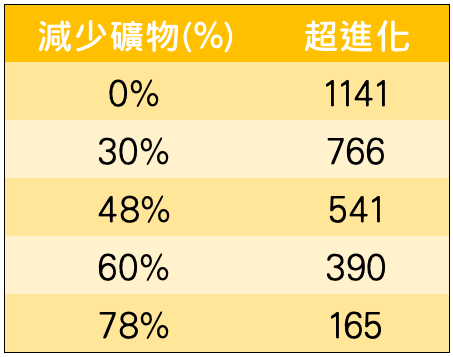 下表是為各種減礦時的礦物量(寶物全滿、無月間加成):
