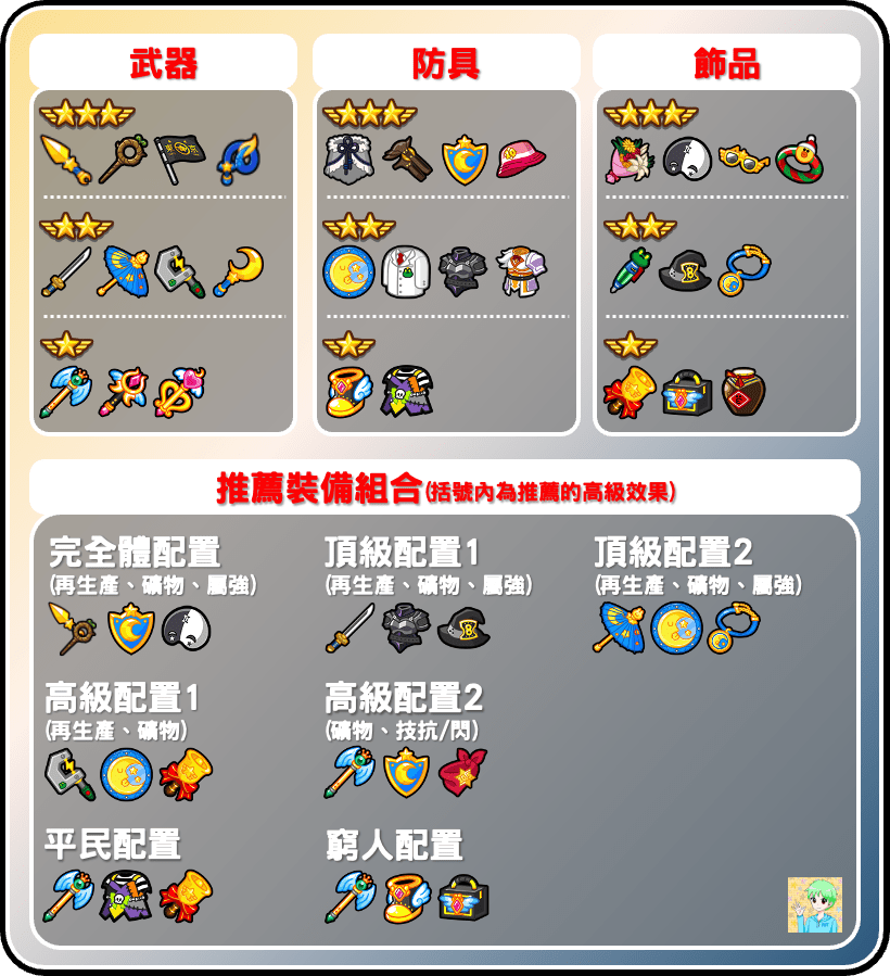 圖片上半部是推薦能使用的裝備,其中推薦的屬性裝備皆為合作裝備,目前適用的減產必中有本月的八星武器「安布洛西雅」,新年的「新年青龍鞭」或賞月的「月光沈寂匕首」亦是不錯的選擇。