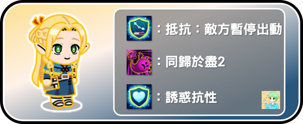 瑪露希爾的出現,克制不少以站位為傲的角色,像是12月份「銀時」合作寵神樂」、不在上圖的費倫、鱷魚熊大…等,透過降低射程使打手技能更容易命中。此外若九星後拿到抗停產,更能克制大和、菲茲…等停產的水屬性角色,算是相當泛用的角色。