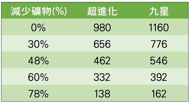 下表是為各種減礦時的礦物量(寶物全滿、無月間加成):