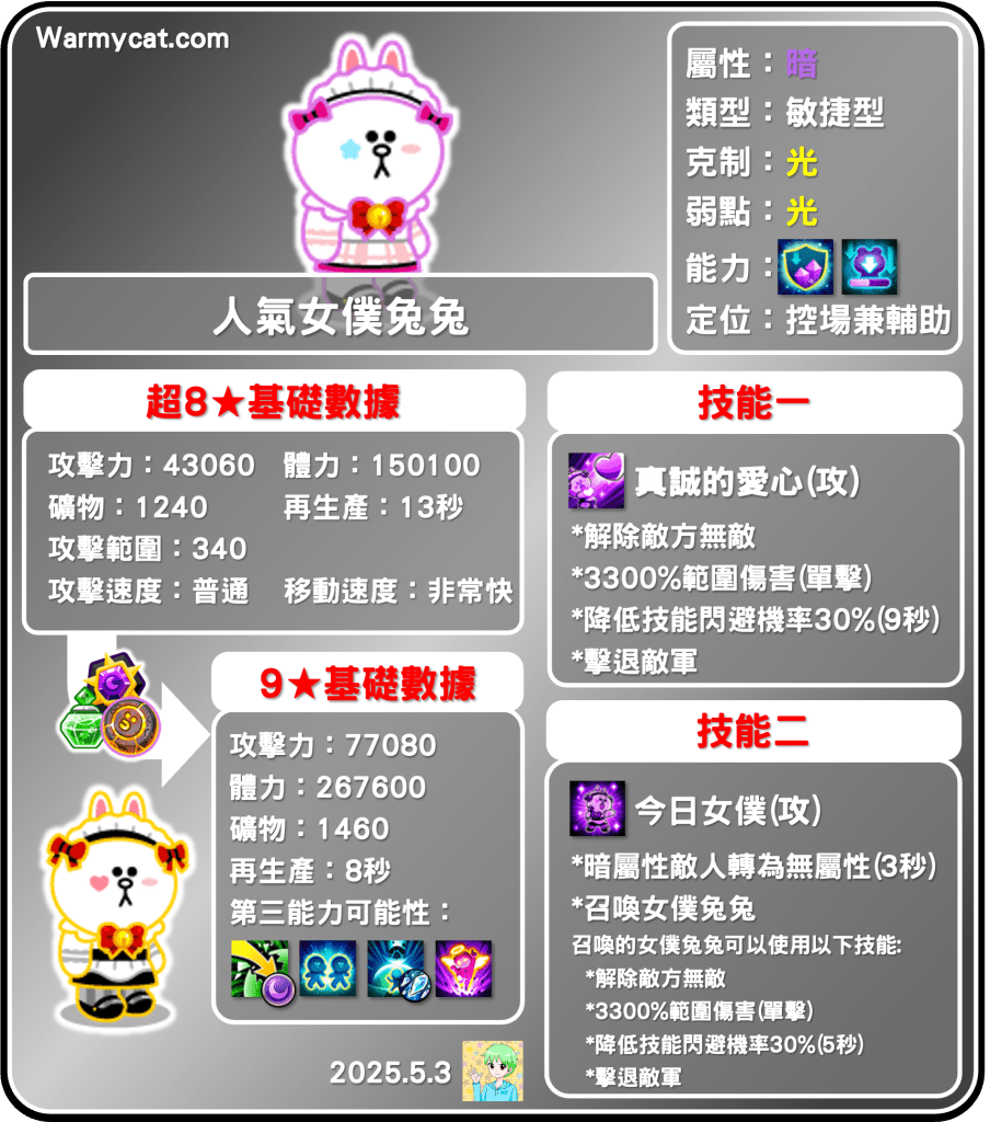 女僕兔兔是暗屬性敏捷型,攻擊力4.3萬、體力15萬,兩項數據在敏捷型當中屬於中等,沒到太突出但也不算糟,站位340點是近期敏捷型中站得較遠的,不過還是偏短容易被其他角色的技能打到,能力有抵抗增加礦物成本,這項能力可以同時防範增礦1跟2,但整體強度我認為比抵抗停產弱,第二能力是妨礙敵人生產,是九星登場以來第5隻新礙產寵。