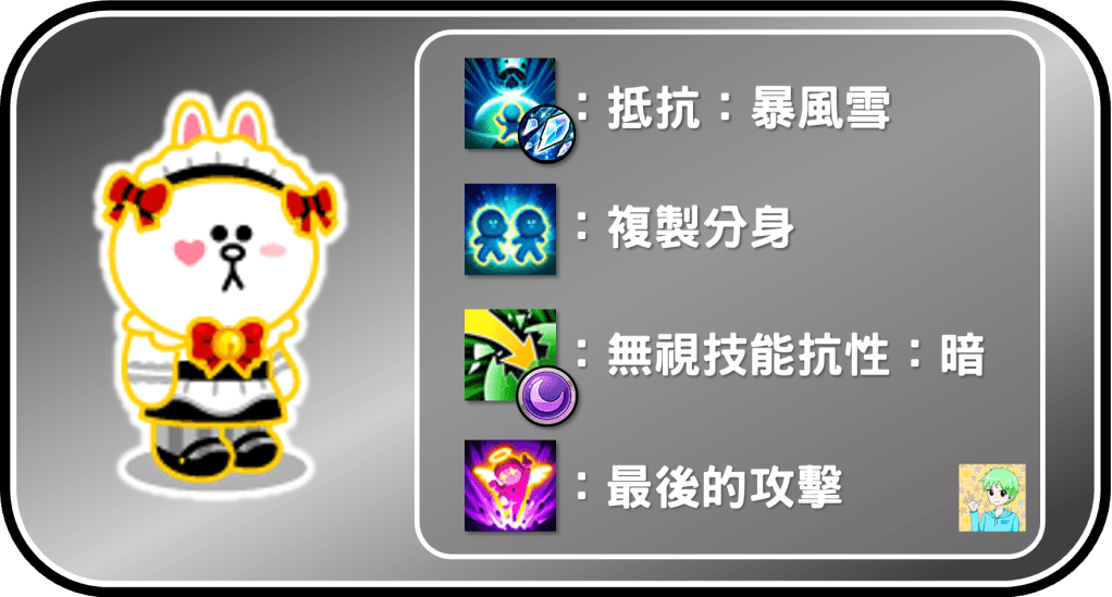 女僕兔兔九星進化後,可以從以上四種能力中隨機獲得一項,能力選擇蠻多樣化的,可以說各有其特色,如果想克制暗屬性就比較推薦「無視暗屬技能抗性」。如果想要玩擊退/召喚流,可以選擇「最後的攻擊」,穩定一點的玩法可以選擇「複製分身」。「抵抗暴風雪」雖然不弱,但對於兔兔不會改變太多,所以不是優先建議!此外要注意九星能力無法套用在「召喚體」身上喔!