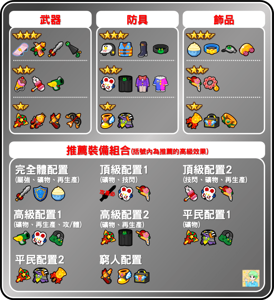 圖片上半部是推薦能使用的裝備,目前適用的減產必中有聖誕八星武器「聖誕槍」、自家限定裝「鱷魚王的劍」。女僕兔兔為敏捷型,本身的抗性不足,裝備優先建議提高技能抗性,且由於礦物量也不算高,高級效果可以優先選擇體力/技能抗性等可提高存活率的效果,或者減少再生產時間。