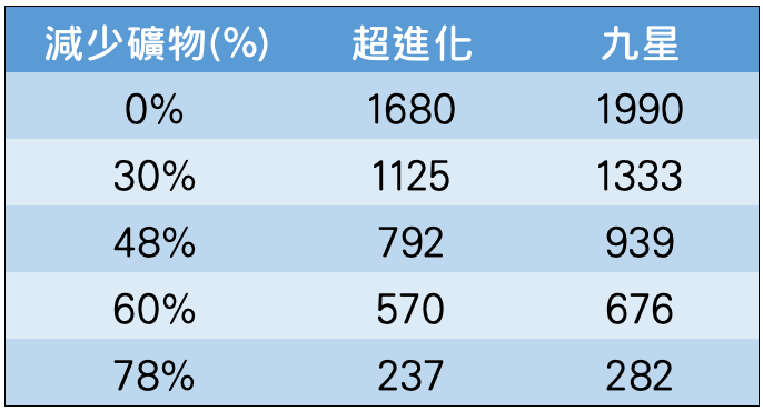 下表是為各種減礦時的礦物量(寶物全滿、無月間加成):