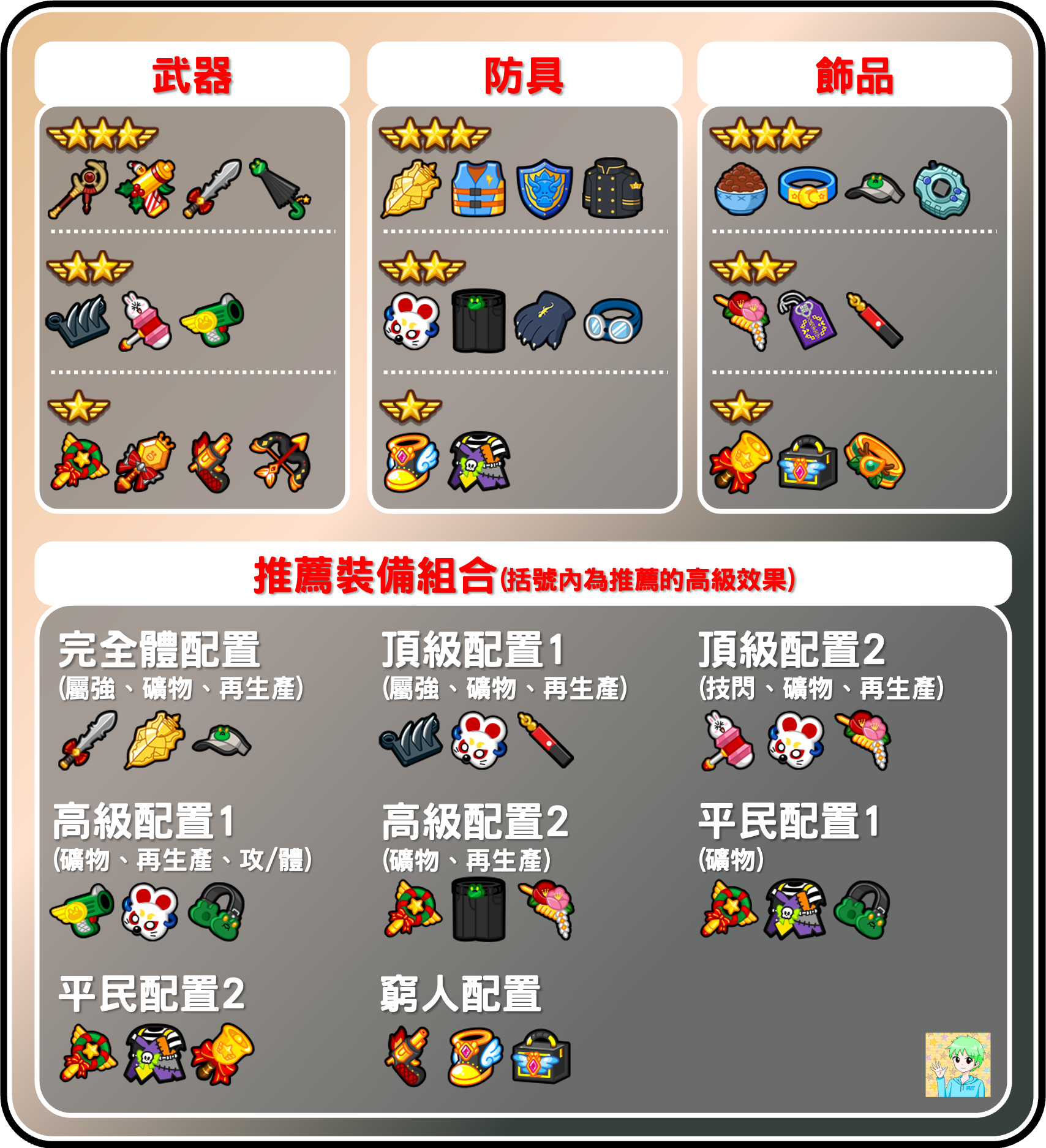 圖片上半部是推薦能使用的裝備,極度建議防具跟飾品都需要減少礦物費用,不然出寵時容易因為礦物量太高而卡到,對於平民玩家建議要有聖誕鈴鐺,不推薦刻意使用無敵腰帶減礦,這樣反而會導致帕瓦生存率降低,若有使用七八星裝備,高級效果優先推薦屬性強化及減少生產礦物費用,能讓帕瓦的輸出最大化。