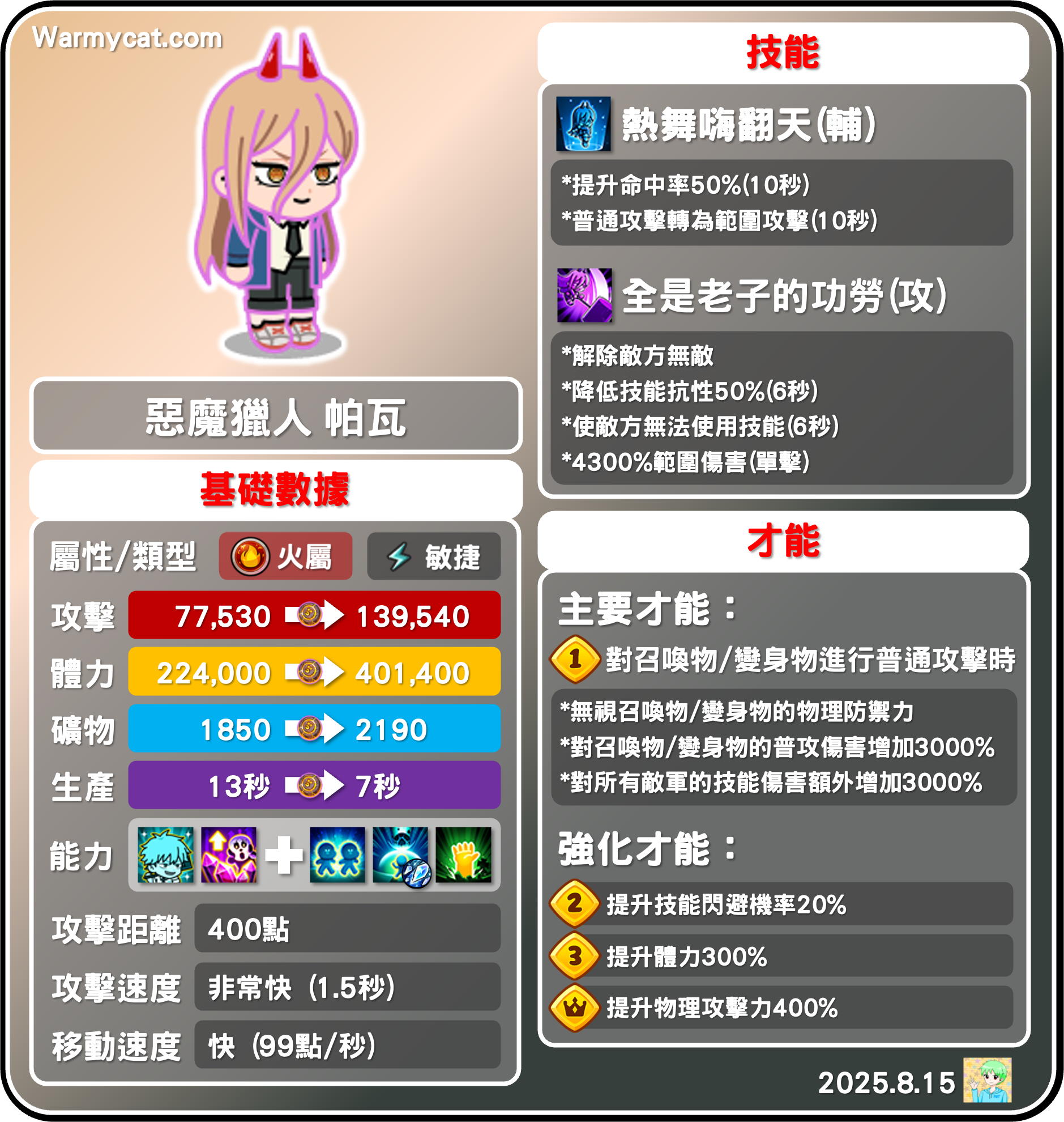 才能大更新後的第一個合作「鏈鋸人」強勢登場!今天要來看第一波才能寵大獎「帕瓦」,身為敏捷型卻有著智慧型傷害的她是否可以挽回敏寵的形象呢?今天就讓我們來用文章來看看吧!