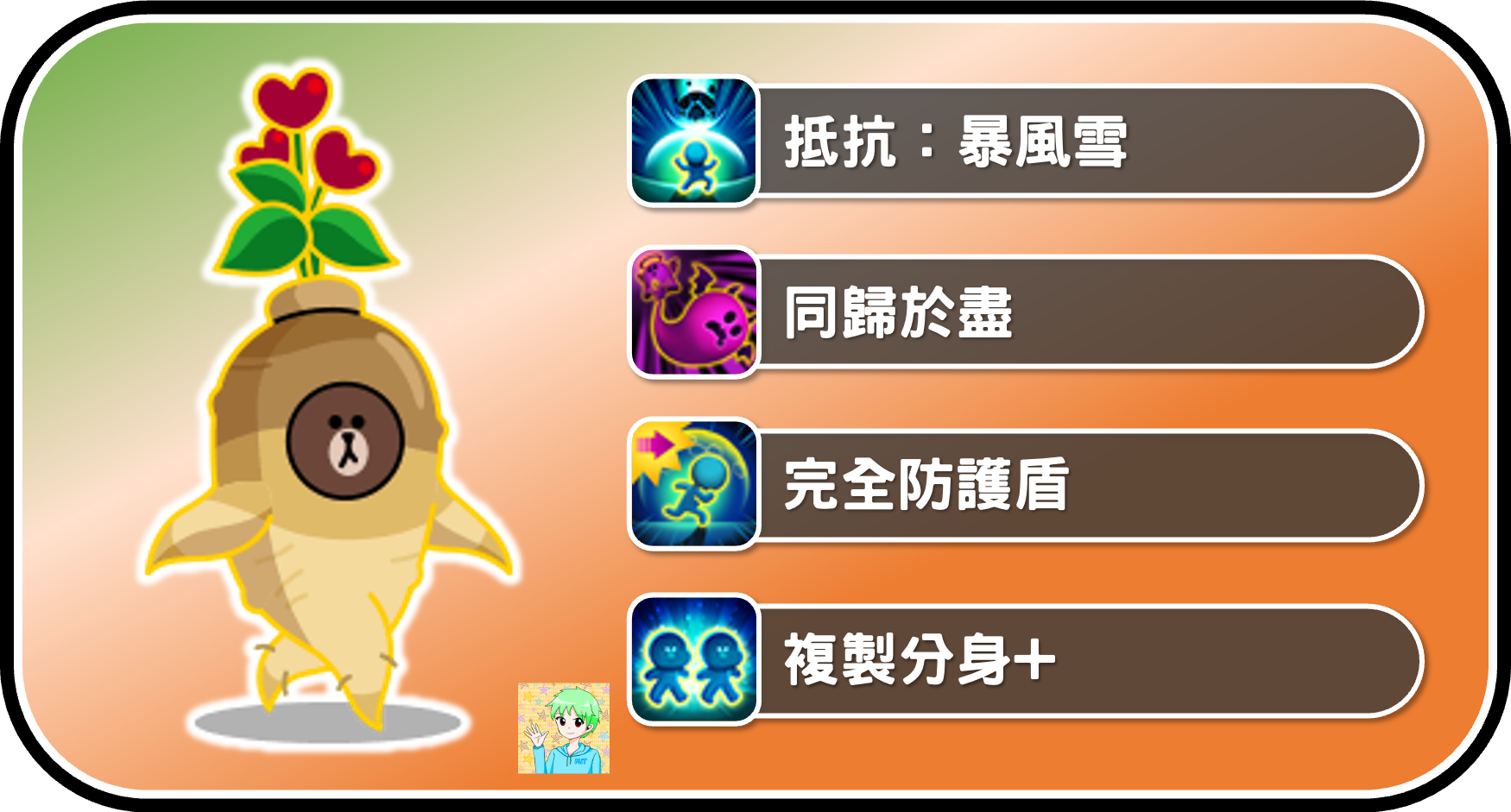胡蘿蔔熊大九星進化後,可以從以上四種能力中隨機獲得一項,PvP優先推薦使用「複製分身+」或「出動防護罩」,分身的優點是有高機會看到兩隻熊大互拋,出動防護罩則是確保熊大出動時不被擊殺,提高使用技能的穩定性。公會戰玩家則可以考慮「同歸於盡2」,並作為首發使用。