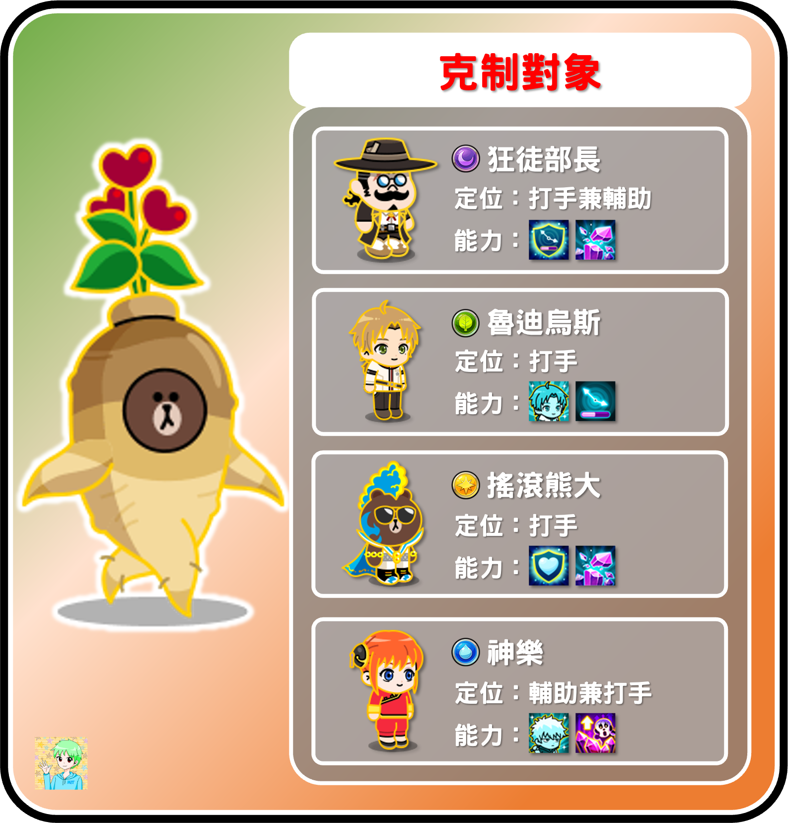 熊大本身的強度,不是他的坦度,也不是他的技能,而是他的出動擊退能力,因此克制對象也就會是現今熱門的智慧型角色,基本上除了賭徒兔兔外的智慧型都在劫難逃了,賭徒兔兔勉強能苟活,還得多虧他的電暈技能前搖很短,根本不可能被斷招,即使被斷也還有「最後的攻擊」能補救,算是本次少數的智慧型倖存者。