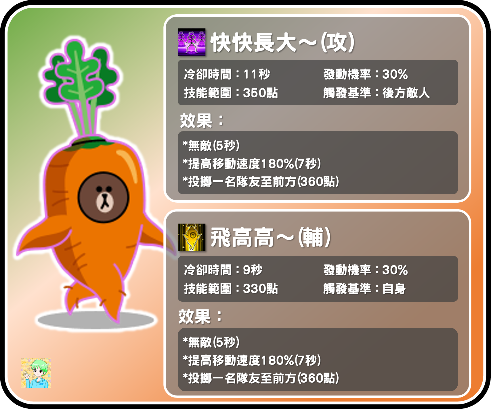 胡蘿蔔熊大的二技能是輔助技能,效果有無敵、提高移動速度跟投擲隊友,九星若有習得分身能力,開場有機會看到兩隻熊大互拋的畫面,可以快速在開場搶線,配合才能淀治可以有不錯的效果,需注意投擲對象將以「體力較高者」為優先選擇,玩家可透過裝備、角色等級…等數值來選擇被拋擲的角色。