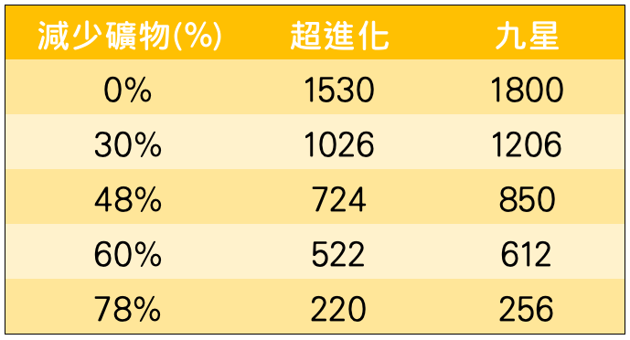 下表是為各種減礦時的礦物量(寶物全滿、無月間加成):