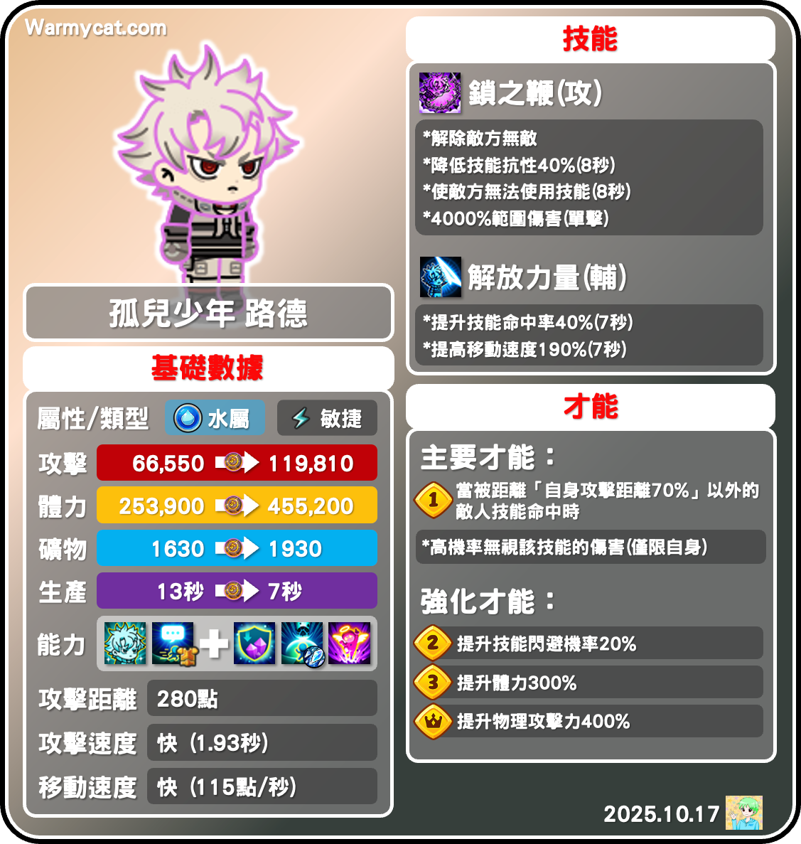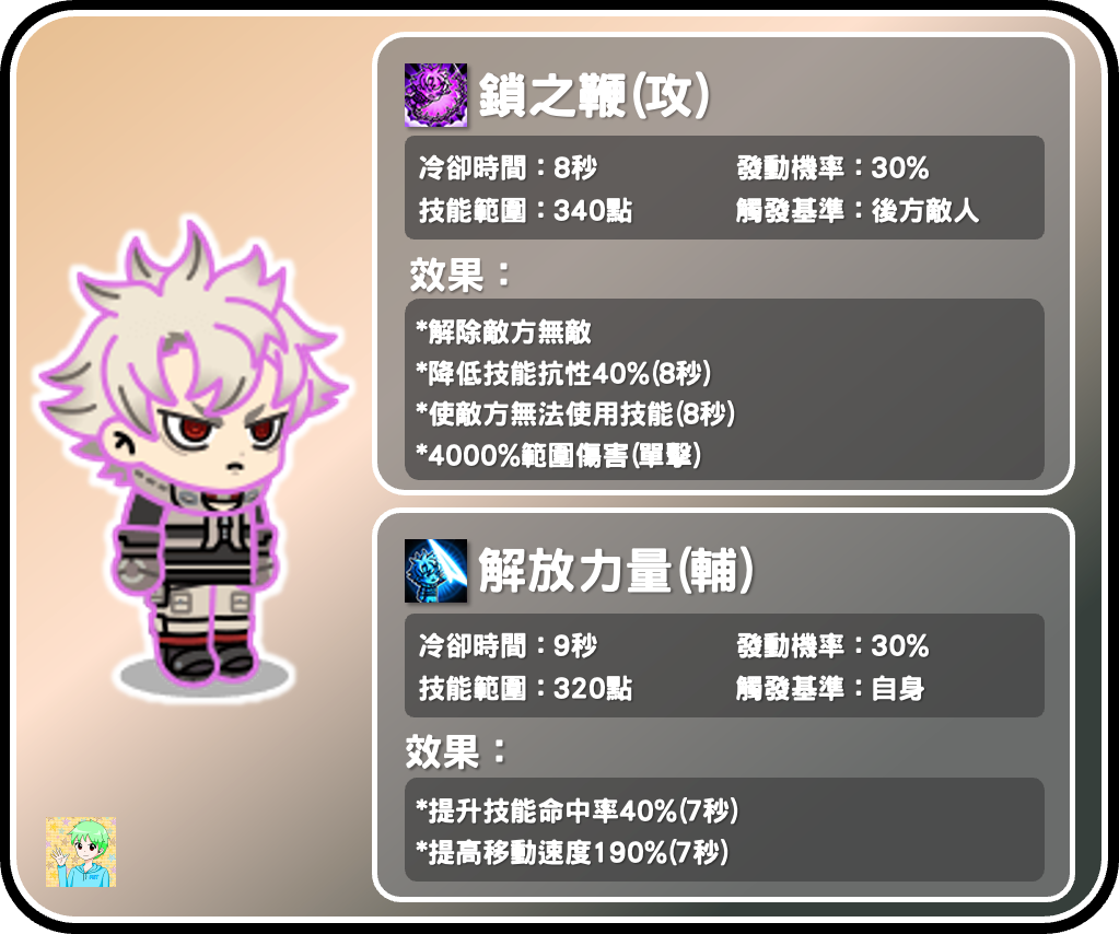 路德的二技能是輔助技能,效果有提高命中率跟移動速度,其中提高移速的效果高達190%,非常適合作為卡位的輔助角色,在跑跑活動中更是一隻必定帶上場的角色!