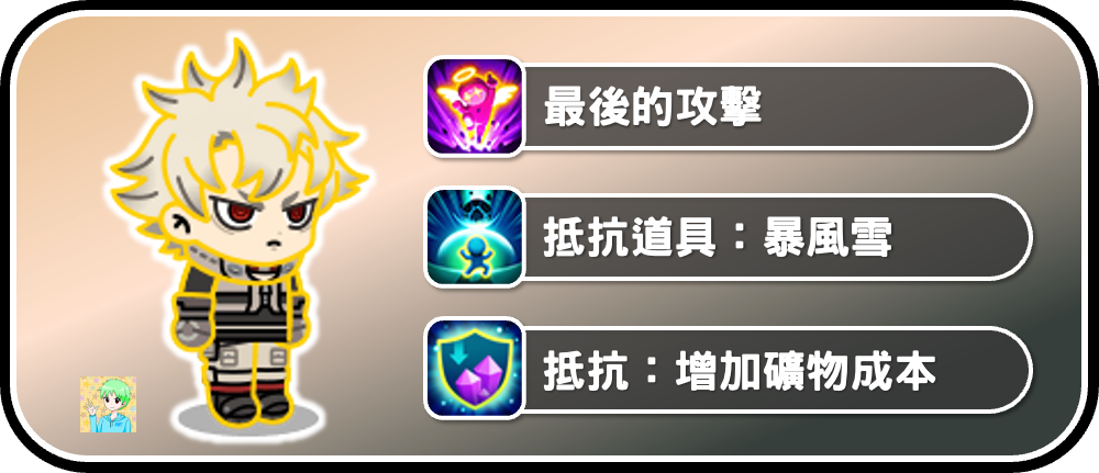 路德九星進化後,可以從以上三種能力中隨機獲得一項,任一種能力都可以在PvP中使用,若不想面對增礦隊,或是隊伍的角色整體礦物量較高,可以選擇「抵抗增加礦物成本」。「抵抗暴風雪」我個人覺得在PvP蠻不錯的,關鍵時刻可以省下道具,獲勝時可以有更多分數。最後的攻擊是相對不推薦的,因為路德的技能組沒有過多的控場效果,因此幫助較小。有特定需求在花卷重置即可