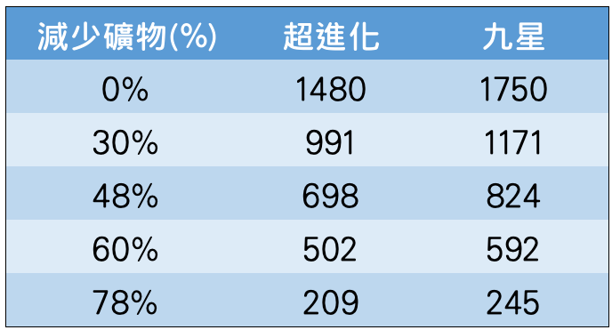 下表是為各種減礦時的礦物量(寶物全滿、無月間加成):
