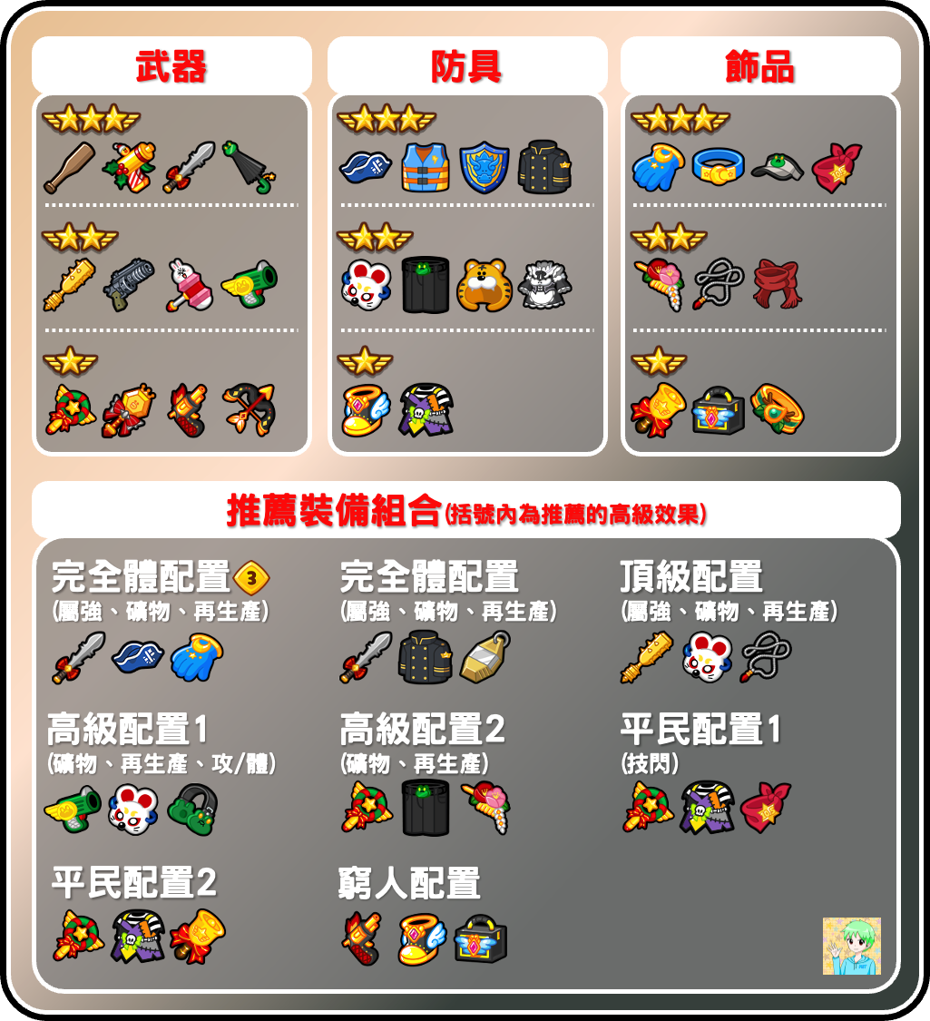 圖片上半部是推薦能使用的裝備,本次將完全體配置分為兩種情況討論,若玩家的路德有達到才能3(體力+300%),那麼防具就可以使用「礦閃抗」的組合,飾品則可使用「貫穿+抗」,來提高技能傷害的輸出;若沒有才能則使用最原始的頂配組合即可;對於平民玩家建議要有聖誕裝備,讓路德能有最基本的輸出及存活率。