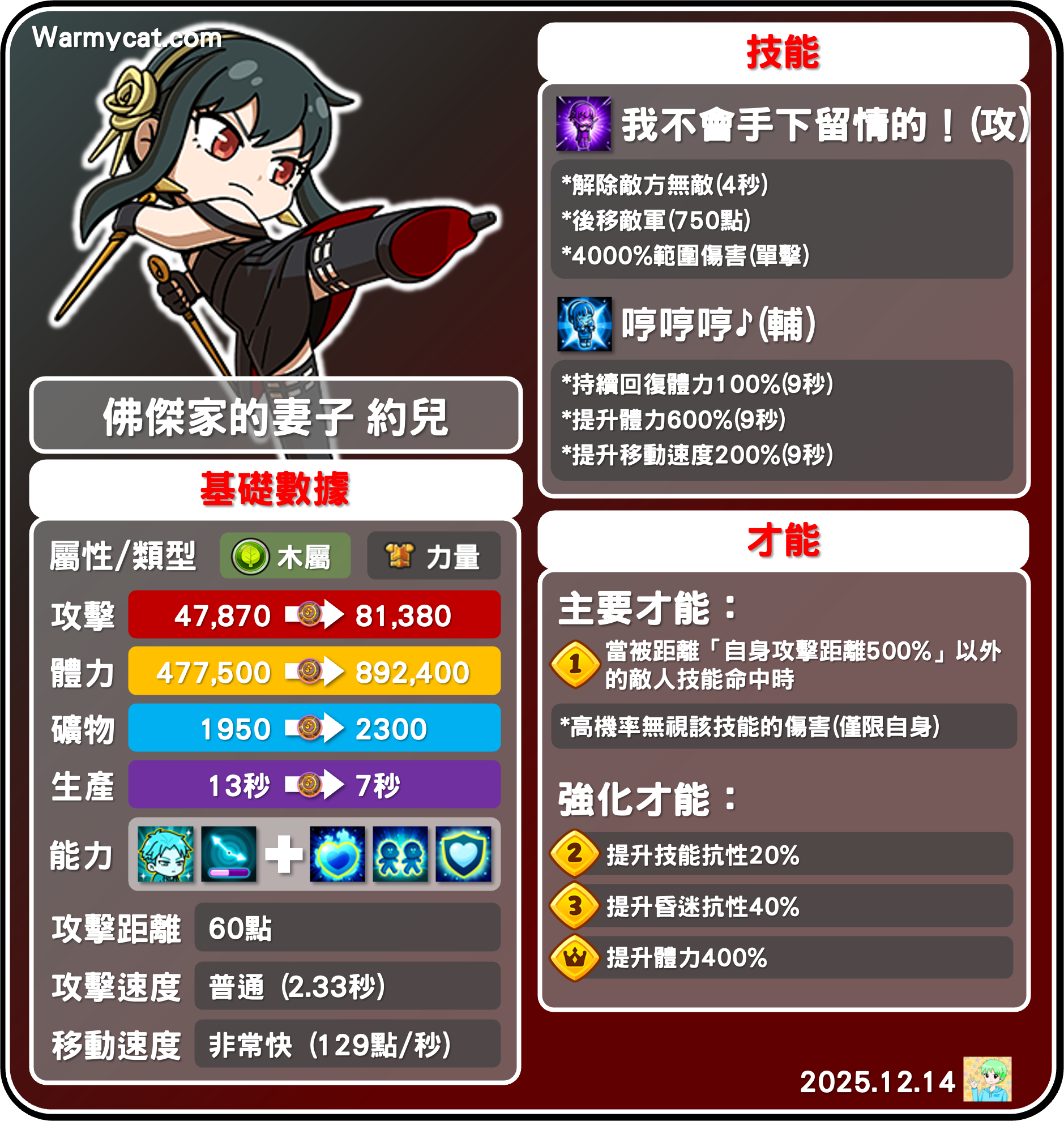 約兒是木屬性力量型,超進化攻擊力4.7萬、體力47.7萬,是隻數據極佳的坦克,對於新手玩家是個能打能坦的好角色,站位60點也相當優異,可以有不錯的卡位效果,隨之而來的就是極高的礦物量,超進化就有著逼近2000的礦物,若沒有足夠充足的減礦,基本上就不建議隨意九星。能力除了有小隊外,還有久違不見的能力「暫停敵方出動」,是抗停產、才能系統登場後第一波的停產寵。