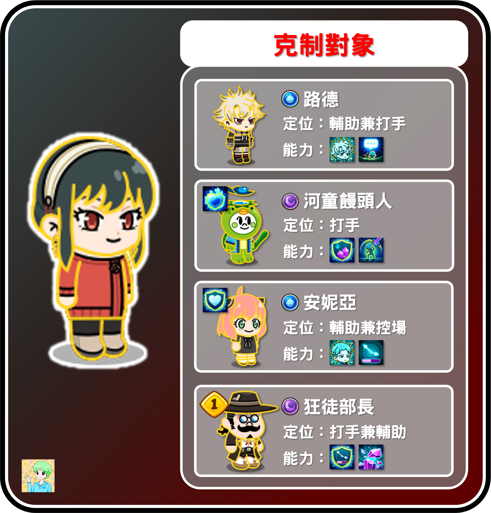 約兒對於目前環境來說,最主要的作用就是取得九星毅力,用來抗衡河童饅頭人,以及解放才能後抗衡對手的後排打手,像是狂徒部長、怕瓦、惠惠…等,但要注意無法免疫路德的技能傷害,因為路德的站位不夠遠,敵方站位至少需要300點以上才能被免疫,若不幸拿到誘惑抗性,也是勉強可以克制一下安妮亞,只是真的不建議用誘惑抗性就是了。