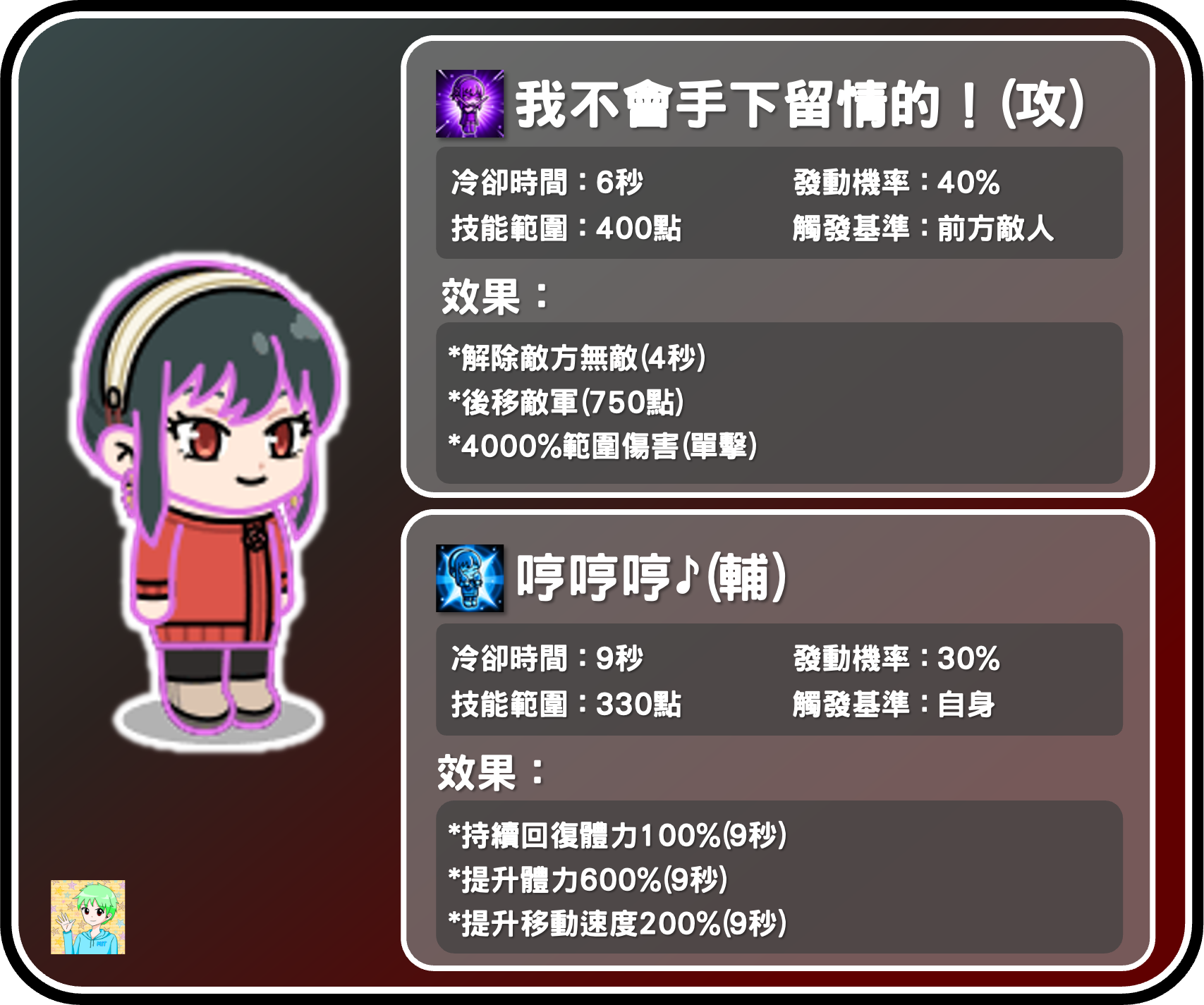 約兒的二技能是輔助技能,有回血、倍體跟提高移動速度,可以強化開場卡位跟約兒自身的坦度,而且提升的數值都相當浮誇,直接登上遊戲最高數據,尤其是回血效果,配合約兒自身優秀的體力數據,多少也能強化隊伍的坦度,雖然沒有無敵效果,但這部分可以靠隊友或才能彌補,因此也不算太大的缺陷。