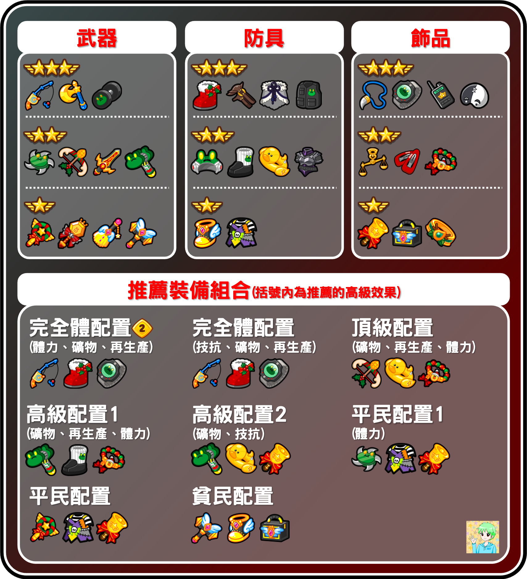 飾品的搭配也比較單一,建議優先選擇「礦閃抗」的組合,八星裝備有青蛙手錶跟新年項鍊可以選擇,七星裝備則僅有聖誕樹裝飾,或者合作的木屬性飾品,平民裝則推薦聖誕鈴鐺。